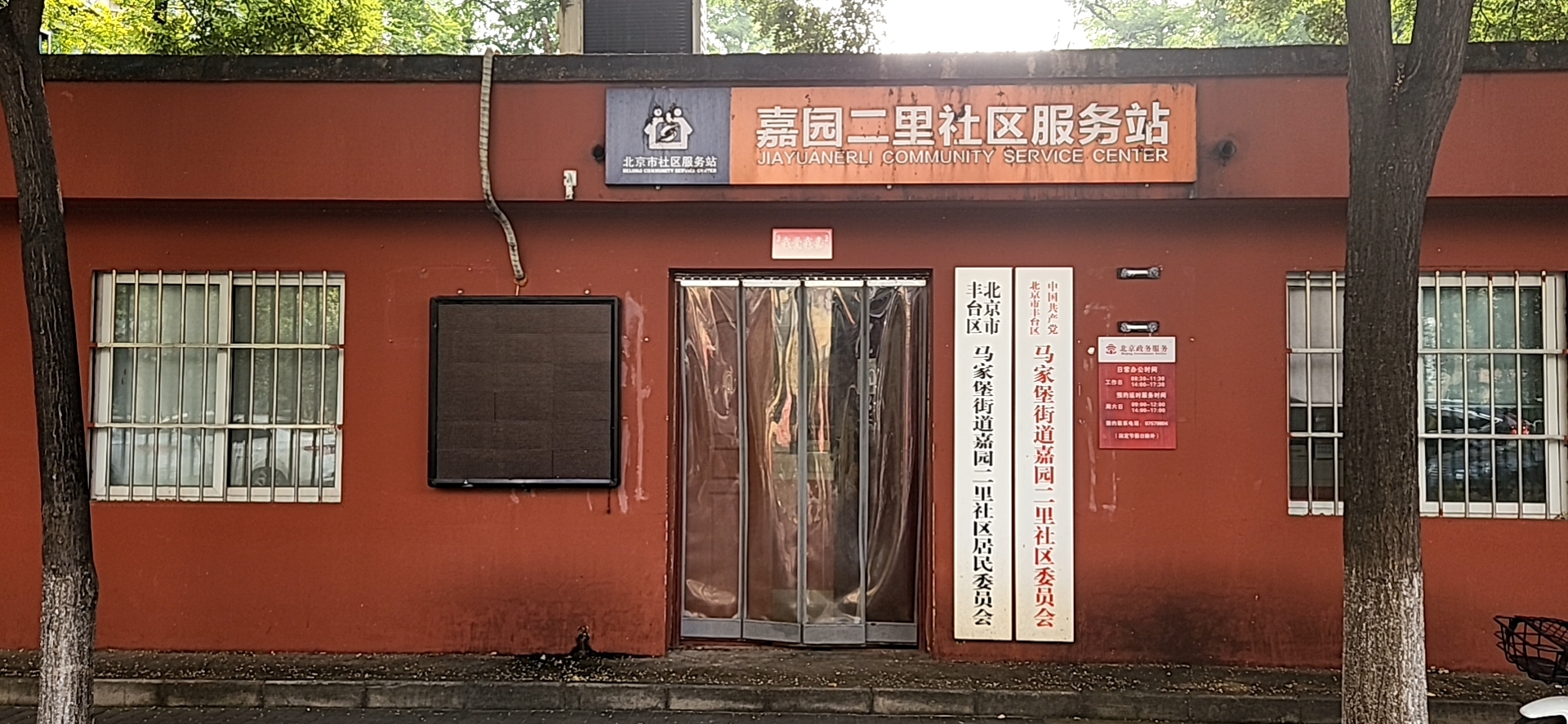 嘉园二里社区,位于丰台区东北部,街道中部, 北至角门北路中心线,东至马家堡西路中心线,南至嘉和路中心线,西至嘉园路中心线。社区居委会办公地点位于嘉园二里4#楼与11#楼之间平房,社区包含嘉园二里小区。辖区内有丰台区马家堡社区卫生服务中心、北京市赵登禹小学校、嘉园第一幼儿园和嘉园实验艺术幼儿园,有时代风帆商业、物美超市等商业体。