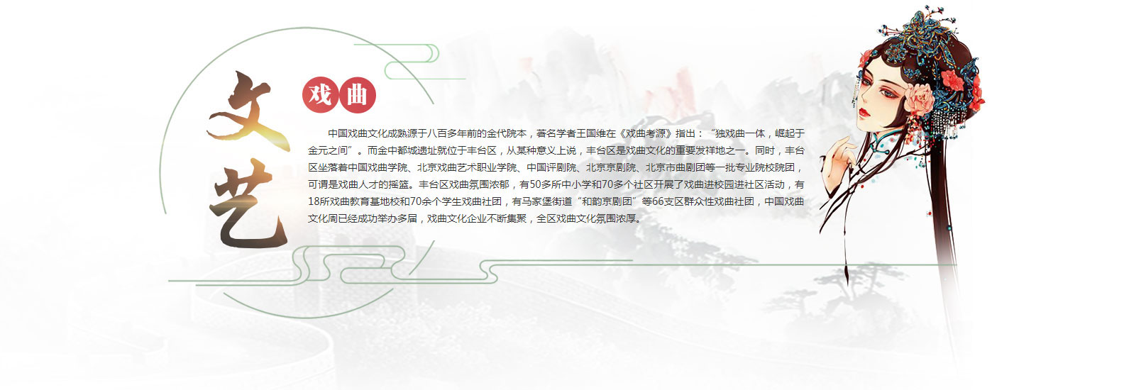 中国戏曲文化成熟源于八百多年前的金代院本,著名学者王国维在《戏曲考源》指出:“独戏曲一体,崛起于金元之间”。而金中都城遗址就位于丰台区,从某种意义上说,丰台区是戏曲文化的重要发祥地之一。同时,丰台区坐落着中国戏曲学院、北京戏曲艺术职业学院、中国评剧院、北京京剧院、北京市曲剧团等一批专业院校院团,可谓是戏曲人才的摇篮。丰台区戏曲氛围浓郁,有50多所中小学和70多个社区开展了戏曲进校园进社区活动,有18所戏曲教育基地校和70余个学生戏曲社团,有马家堡街道“和韵京剧团”等66支区群众性戏曲社团,中国戏曲文化周已经成功举办多届,戏曲文化企业不断集聚,全区戏曲文化氛围浓厚。