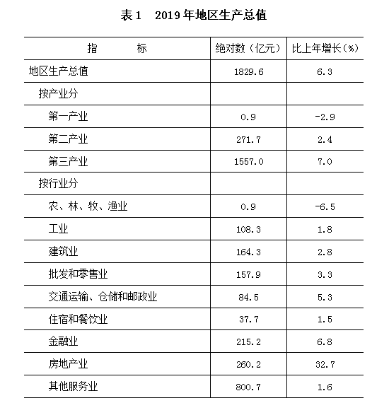 经济发展:初步核算,全年实现地区生产总值1829.6亿元,比上年增长6.3%。其中,第一产业增加值0.9亿元,下降2.9%;第二产业增加值271.7亿元,增长2.4%;第三产业增加值1557亿元,增长7%。三次产业结构为0.05:14.85:85.1。按常住人口计算,全区人均地区生产总值达到8.9万元,比上年增长11.1%。