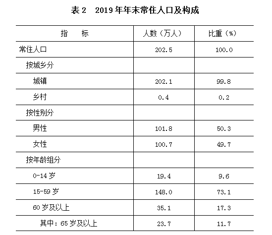人口:年末全区常住人口202.5万人,比上年末减少8万人。其中,常住外来人口64.1万人,比上年末减少5.7万人,占常住人口的比重为31.7%,比上年末下降1.5个百分点。在常住人口中,城镇人口202.1万人,占常住人口的比重为99.8%。全区常住人口出生率为6.73‰,死亡率为5.41‰,自然增长率为1.32‰。常住人口密度为每平方公里6628人,比上年末减少262人。年末全区户籍人口116.6万人,比上年末增加1.7万人。