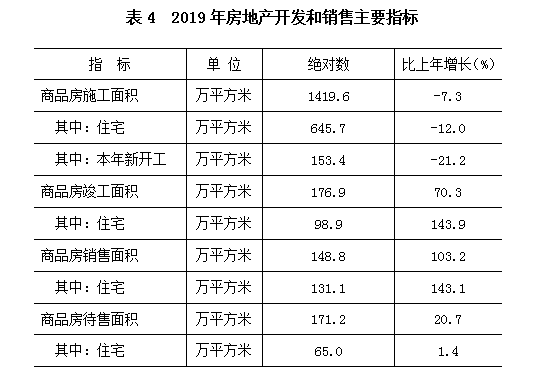 年末全区商品房施工面积1419.6万平方米,比上年末下降7.3%。其中,本年新开工面积153.4万平方米,下降21.2%。全年商品房竣工面积176.9万平方米,增长70.3%。