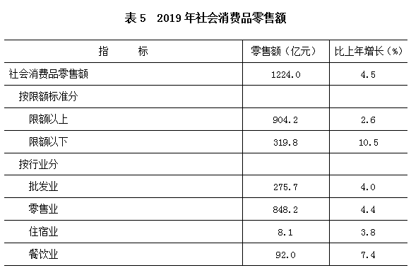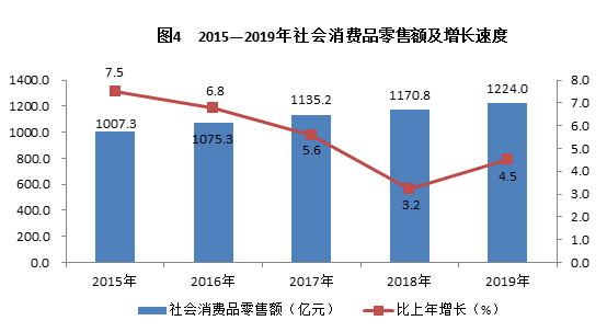 全年实现社会消费品零售额1224亿元,比上年增长4.5%。其中,实现网上零售额113.7亿元,增长14.5%。在限额以上批发和零售企业中,中西药品类实现零售额156.7亿元,比上年增长7.4%;汽车类实现零售额185亿元,下降13.1%。