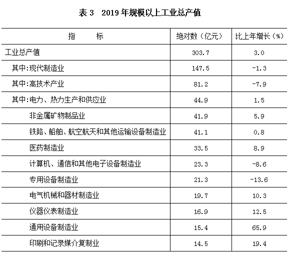 工业:全年规模以上工业企业实现工业总产值303.7亿元,比上年增长3%。从主要行业看,医药制造业增长8.9%,非金属矿物制品业增长5.9%,专用设备制造业下降13.6%,计算机、通信和其他电子设备制造业下降8.6%。