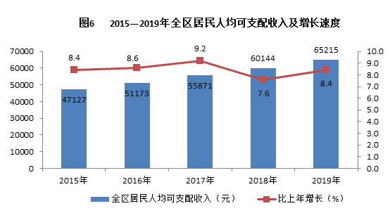 人民生活:全年全区居民人均可支配收入65215元,比上年增长8.4%。全区居民人均消费支出43468元,比上年增长6.2%;恩格尔系数为20.0%,比上年提高0.4个百分点。全区居民人均住房建筑面积29.9平方米。