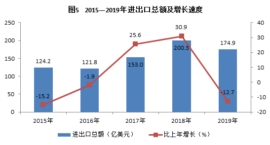 对外经济:全年进出口总额174.9亿美元,比上年下降12.7%。其中,进口123.9亿美元,下降18.8%;出口51亿美元,增长6.7%。