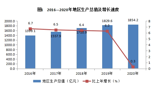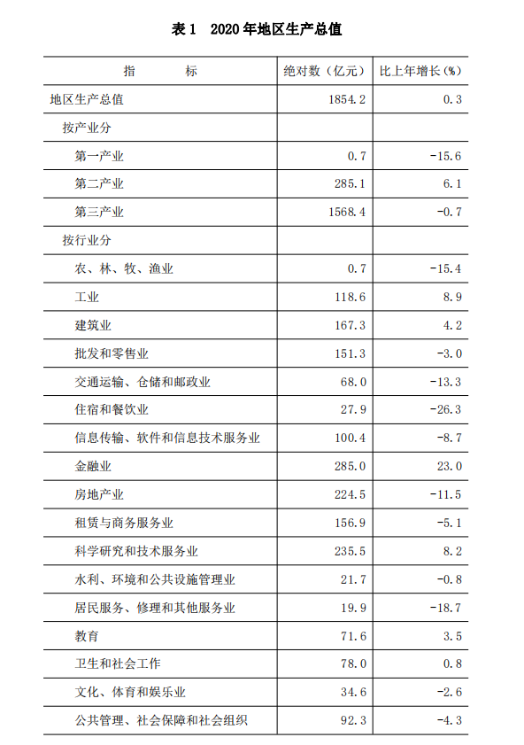 经济发展:初步核算,全年实现地区生产总值1854.2亿元,比上年增长0.3%。其中,第一产业增加值0.7亿元,下降15.6%;第二产业增加值285.1亿元,增长6.1%;第三产业增加值1568.4亿元,下降0.7%。三次产业结构为0.04:15.4:84.6。