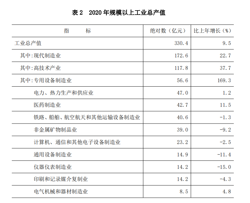 工业:全年规模以上工业企业实现工业总产值330.4亿元,比上年增长9.5%。从主要行业看,专用设备制造业增长1.7倍,医药制造业增长11.5%,电力、热力生产和供应业增长1.2%。
