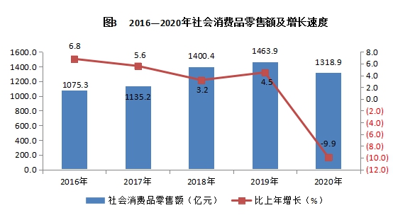 全年实现社会消费品零售额1318.9亿元,比上年下降9.9%。其中,实现网上零售额42.4亿元,增长32.5%。在限额以上批发和零售企业中,中西药品类实现零售额13.6亿元,比上年增长2%;汽车类实现零售额143.8亿元,下降23.1%。