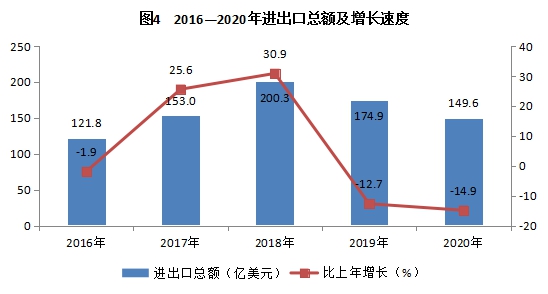 对外经济:全年进出口总额149.6亿美元,比上年下降14.9%。其中,进口106亿美元,下降14.6%;出口43.6亿美元,下降15.4%。