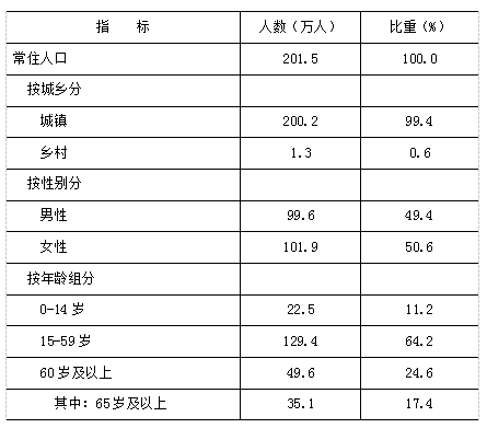 人口:年末全区常住人口201.5万人,比上年末减少0.4万人。其中,常住外来人口63.6万人,比上年末减少0.6万人,占常住人口的比重为31.6%,比上年末下降0.2个百分点。在常住人口中,城镇人口200.2万人,占常住人口的比重为99.4%。全区常住人口出生率为5.61‰,死亡率为7.18‰,自然增长率为-1.57‰。常住人口密度为每平方公里6595人,比上年末减少13人。年末全区户籍人口118.1万人,比上年末增加1万人。
