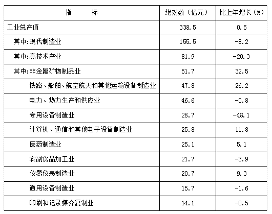 工业:全年规模以上工业企业实现工业总产值338.5亿元,比上年增长0.5%。从主要行业看,非金属矿物制品业增长32.5%,铁路、船舶、航空航天和其他运输设备制造业增长26.2%,计算机、通信和其他电子设备制造业增长11.8%。