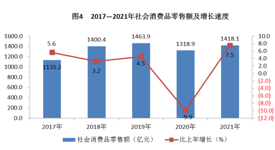 全年实现社会消费品零售额1418.1亿元,比上年增长7.5%。其中,实现网上零售额60.1亿元,增长27.7%。在限额以上批发和零售企业中,中西药品类实现零售额19.6亿元,比上年增长39.3%;汽车类实现零售额145.7亿元,下降0.2%。