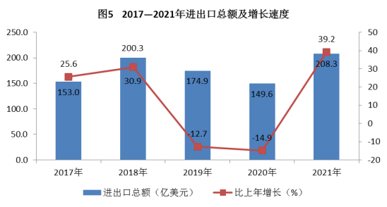 全年进出口总额208.3亿美元,比上年增长39.2%。其中,进口155.2亿美元,增长46.4%;出口53.1亿美元,增长21.9%。