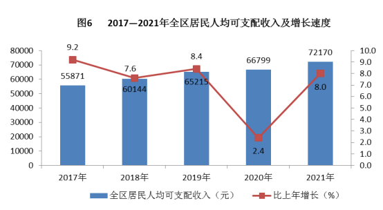 人民生活:全年全区居民人均可支配收入72170元,比上年增长8%。全区居民人均消费支出43334元,比上年增长12.6%;恩格尔系数为21.2%,比上年下降0.6个百分点。全区居民人均住房建筑面积30.52平方米,比上年增加0.77平方米。