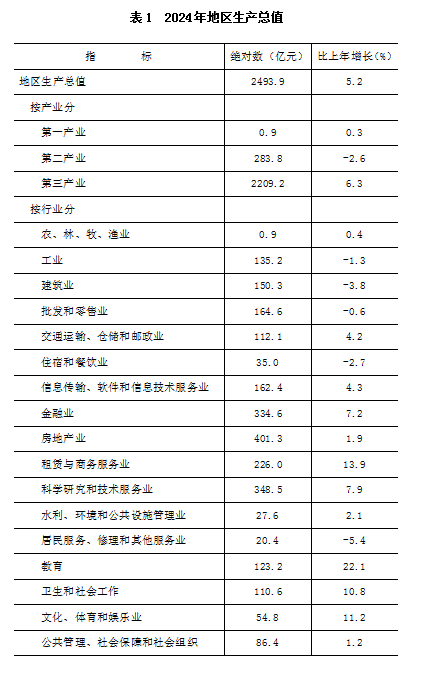 经济发展:初步核算,全年实现地区生产总值2493.9亿元,按不变价格计算,比上年增长5.2%。其中,第一产业增加值0.9亿元,增长0.3%;第二产业增加值283.8亿元,下降2.6%;第三产业增加值2209.2亿元,增长6.3%。三次产业构成为0.04:11.4:88.6。按常住人口计算,全区人均地区生产总值为12.4万元,比上年增长5.4%。