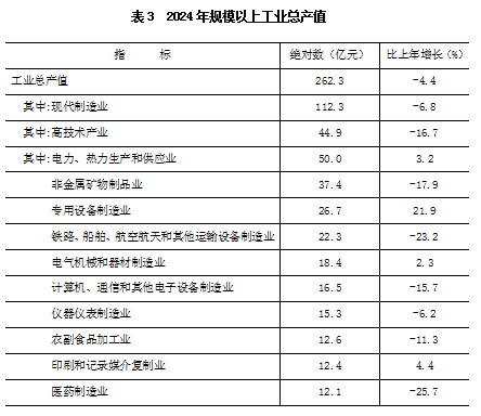 工业:全年规模以上工业企业实现工业总产值262.3亿元,比上年下降4.4%。从主要行业看,专用设备制造业增长21.9%,电力、热力生产和供应业增长3.2%,非金属矿物制品业下降17.9%,铁路、船舶、航空航天和其他运输设备制造业下降23.2%。
