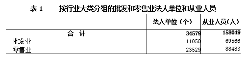 在批发和零售业法人单位中,批发业占32%,零售业占68%。在批发和零售业法人单位从业人员中,批发业占44%,零售业占56%(详见表1)。