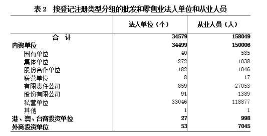 在批发和零售业法人单位从业人员中,内资单位占94.9%,港、澳、台商投资单位占0.6%,外商投资单位占4.5%(详见表2)。
