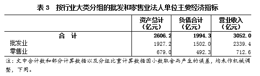 2018年末,批发和零售业法人单位资产总计2606.2亿元,比2013年末增长81.1%。其中,批发业法人单位资产总计1927.2亿元,零售业法人单位资产总计679亿元,分别比2013年末增长77.8%和91.3%。负债合计1994.3亿元。全年实现营业收入3052亿元[注三](详见表3)。
