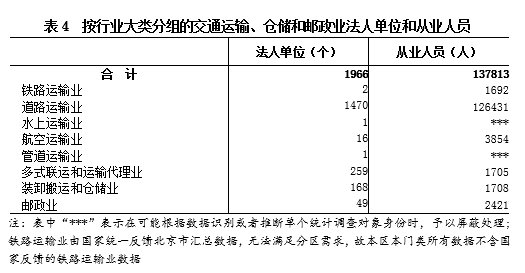 2018年末,全区共有交通运输、仓储和邮政业法人单位1966个,从业人员137813人,分别比2013年末增长3.5%和下降1.4%(详见表4)。