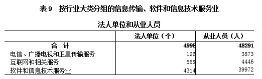 2018年末,全区共有信息传输、软件和信息技术服务业法人单位4998个,从业人员48291人,分别比2013年末增长118.4%和66.9%(详见表9)。