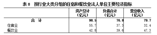 2018年末,住宿和餐饮业法人单位资产总计98.5亿元,比2013年末增长40.7%。其中,住宿业法人单位资产总计55.7亿元,餐饮业法人单位资产总计42.8亿元,分别比2013年末增长19.3%和83.7%。负债合计76.8亿元。全年实现营业收入79.7亿元(详见表8)。