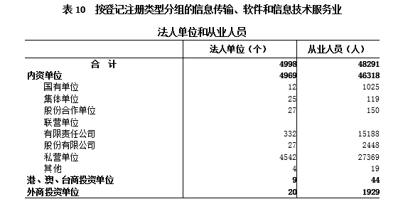 在信息传输、软件和信息技术服务业法人单位从业人员中,内资单位占95.9%,港、澳、台商投资单位占0.1%,外商投资单位占4%(详见表10)。