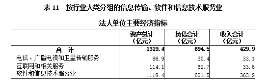 2018年末,信息传输、软件和信息技术服务业法人单位资产总计1319.4亿元,比2013年末增232%。负债合计694.5亿元。全年实现收入合计429.9亿元(详见表11)。