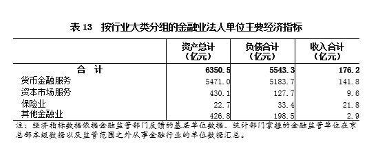 2018年末,金融业法人单位资产总计6350.5亿元,比2013年末增长404.4%。负债合计5543.3亿元。全年实现收入合计176.2亿元(详见表13)。