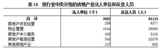 2018年末,全区房地产业法人单位的从业人员61115人,比2013年末增长69.1%。其中,房地产开发经营6377人,比2013年末下降4.2%(详见表14)。