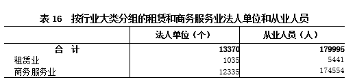 在租赁和商务服务业法人单位中,租赁业占7.7%,商务服务业占92.3%。在租赁和商务服务业法人单位从业人员中,租赁业占3%,商务服务业占97%(详见表16)。