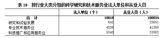 2018年末,全区共有科学研究和技术服务业法人单位10018个,从业人员100034人,分别比2013年末增长11.2%和5%(详见表19)。