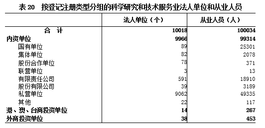 在科学研究和技术服务业法人单位从业人员中,内资单位占99.3%,港、澳、台商投资单位占0.3%,外商投资单位占0.5%(详见表20)。