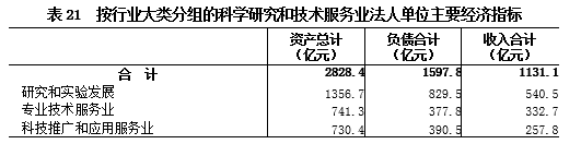 2018年末,科学研究和技术服务业法人单位资产总计2828.4亿元,比2013年末下降4.2%。负债合计1597.8亿元。全年实现收入合计1131.1亿元(详见表21)。