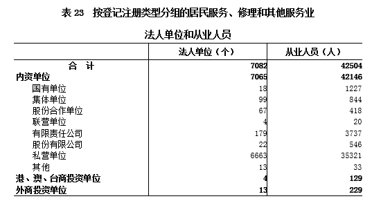 在居民服务、修理和其他服务业法人单位从业人员中,内资单位占99.2%,港、澳、台商投资单位占0.3%,外商投资单位占0.5%(详见表23)。