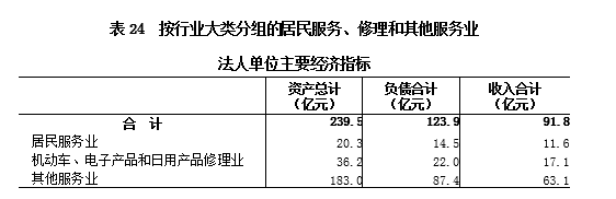 2018年末,居民服务、修理和其他服务业法人单位资产总计239.5亿元,比2013年末增长363.2%。负债合计123.9亿元。全年实现收入合计91.8亿元(详见表24)。