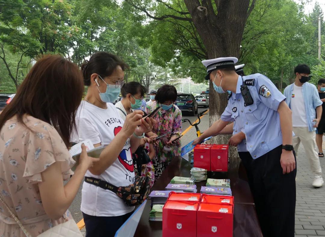 在西四环科丰桥下路口,交警、协管员、公共文明引导员、志愿者同时上岗,引导行人、机动车遵守交通法规,遇停止信号不越线、不逆行、不在路口内乱穿乱行,自觉遵守路口通行规则。同时,向过往市民发放《文明礼让斑马线》折页、《文明交通示范路口安全提示卡》等宣传材料。
