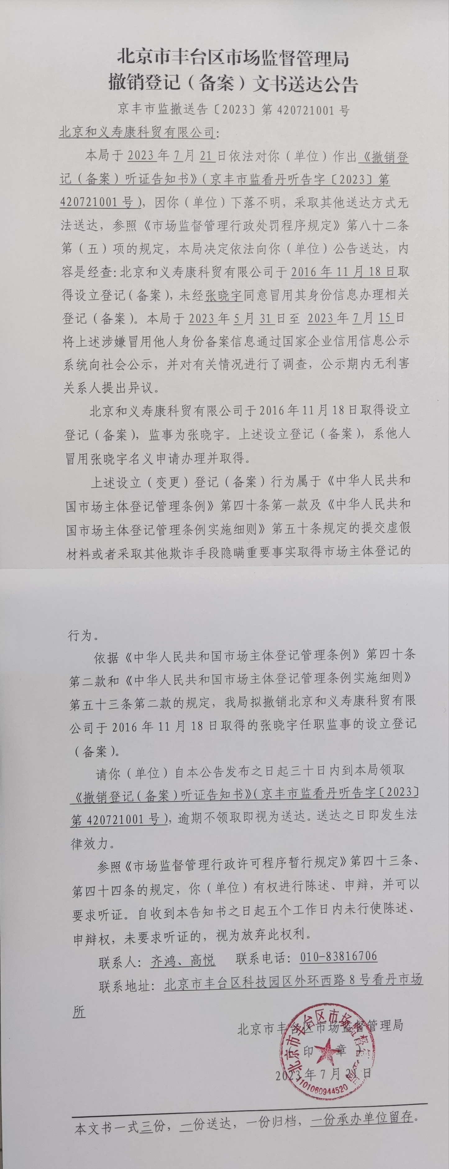 听证公告(北京和义寿康科贸有限公司)-北京市丰台区人民政府网站
