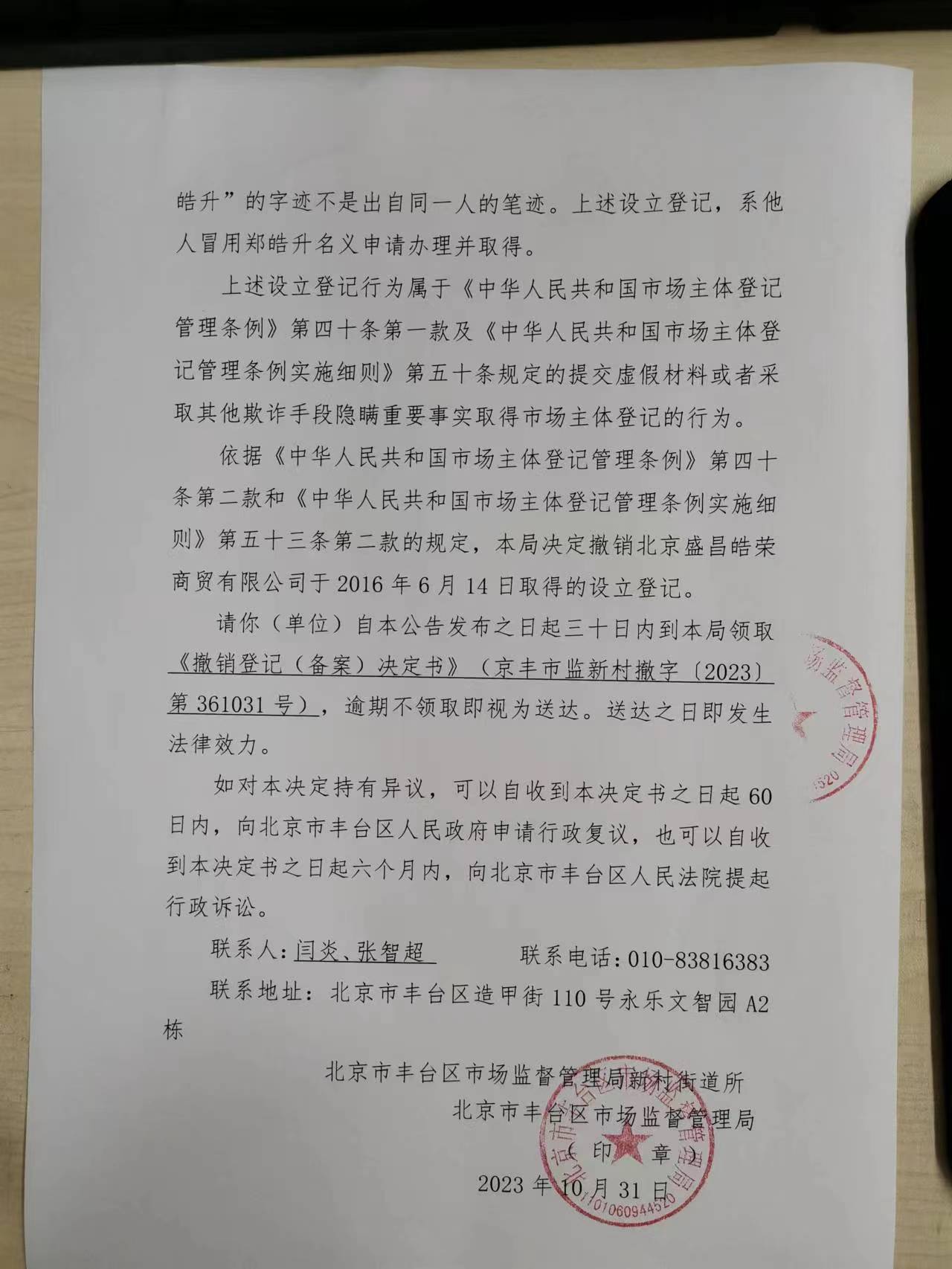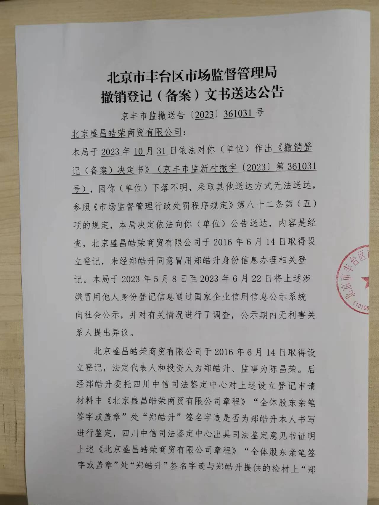 撤销登记(备案)文书送达公告-北京盛昌皓荣商贸有限公司-北京市丰台区人民政府网站