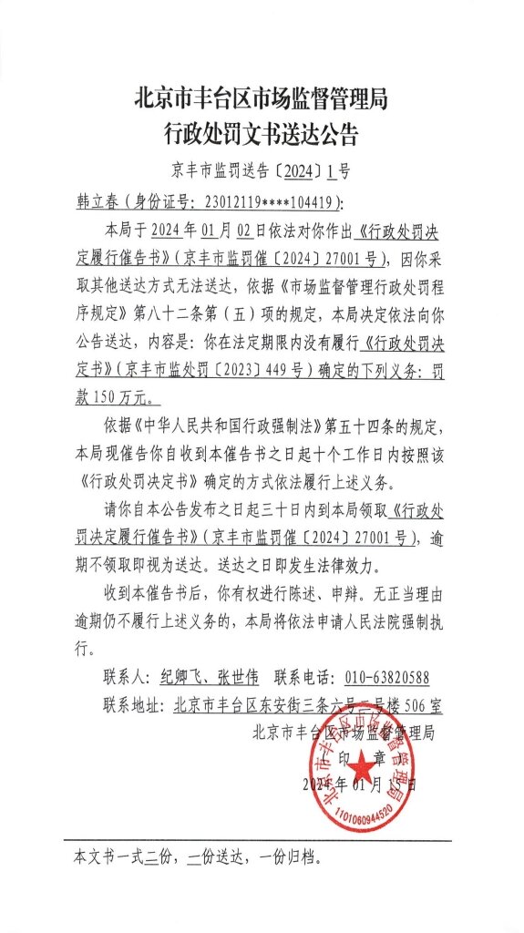 行政处罚文书送达公告(韩立春)-北京市丰台区人民政府网站