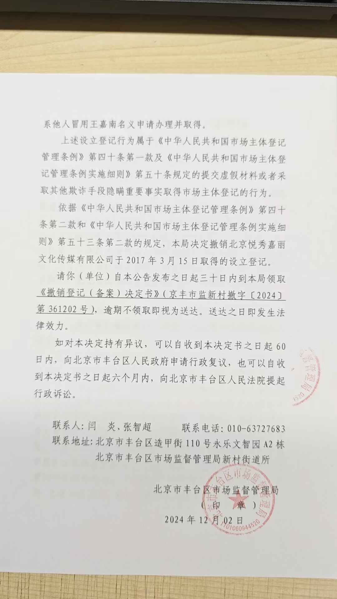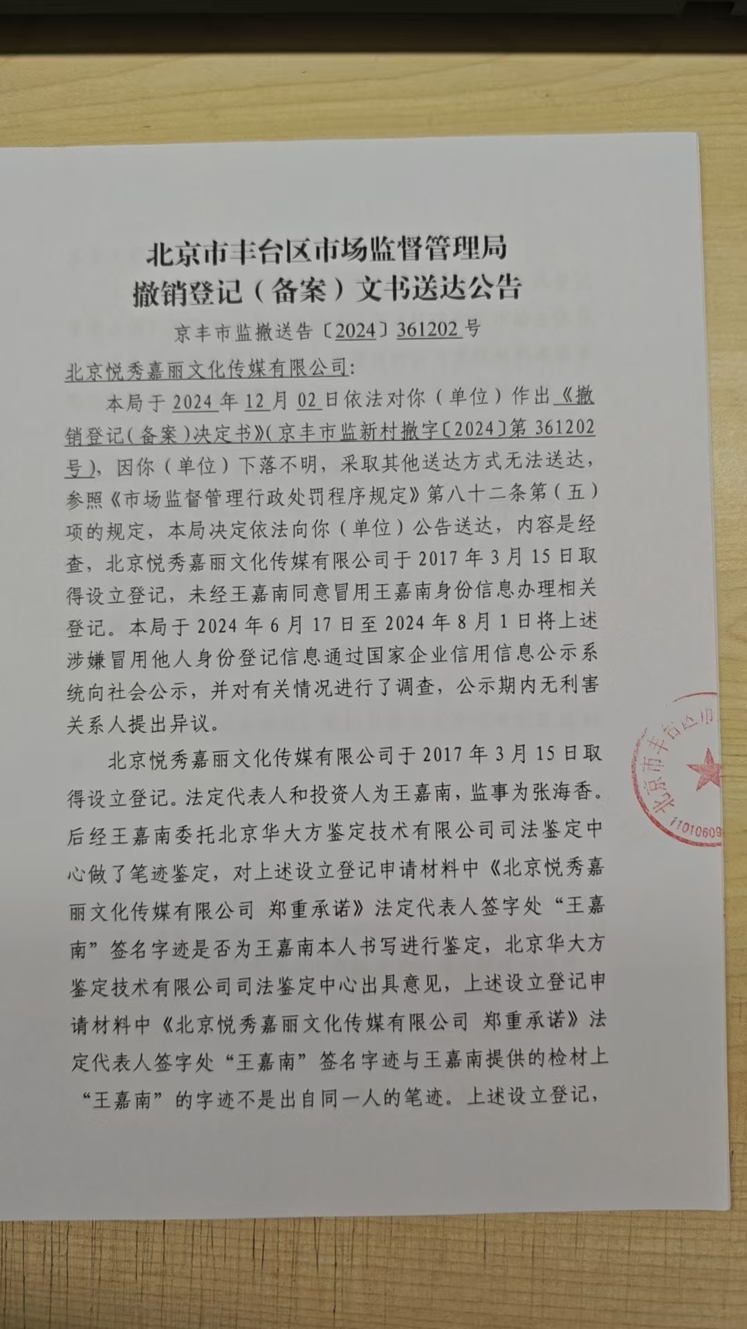 撤销登记(备案)文书送达公告-北京悦秀嘉丽文化传媒有限公司-北京市丰台区人民政府网站