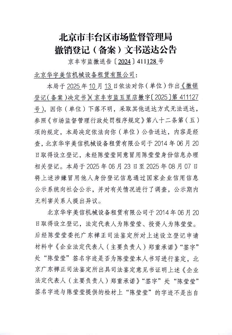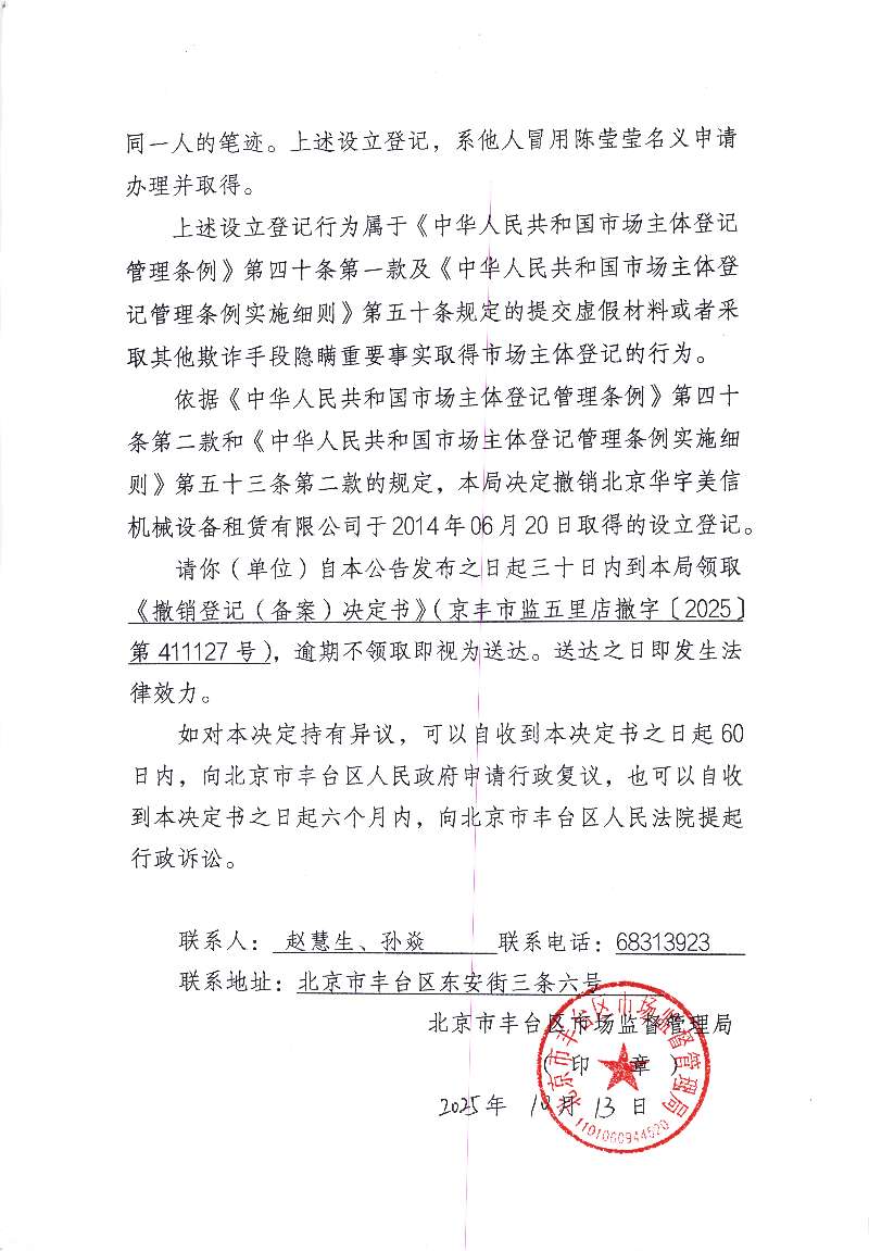 京华宇美信机械设备租赁有限公司 撤销决定文书送达公告-北京市丰台区人民政府网站