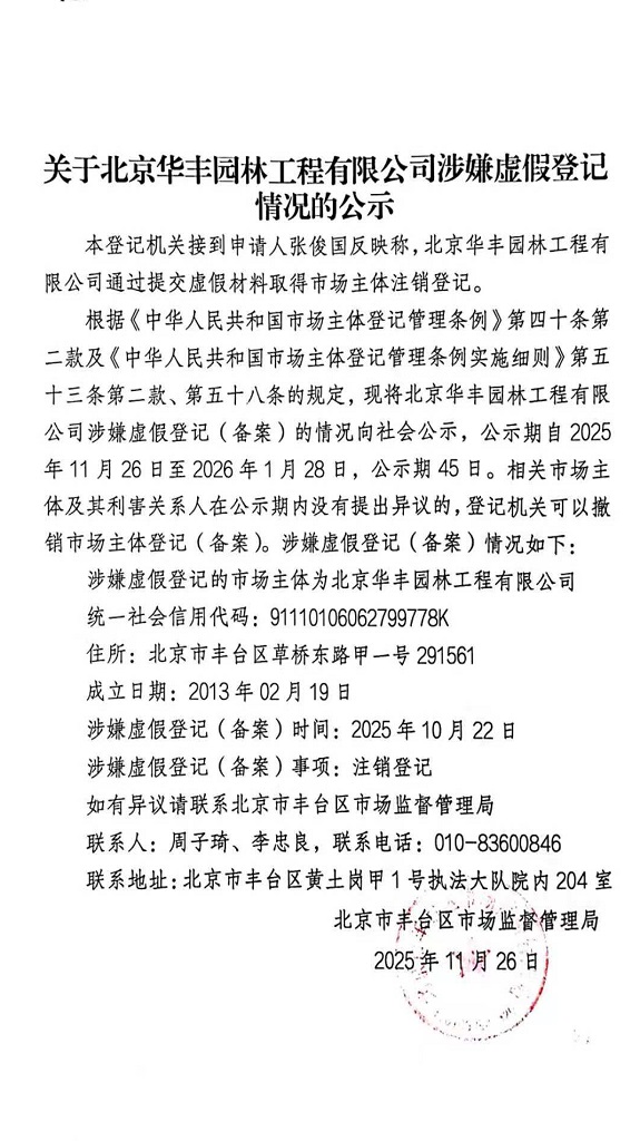 关于北京华丰园林工程有限公司涉嫌虚假登记情况的公示