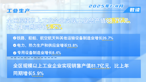2025年1—4月,全区规模以上工业企业实现销售产值81.7亿元,比上年同期增长5.9%,其中出口交货值2.1亿元,下降5.8%。