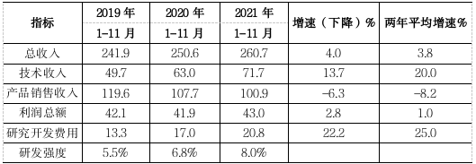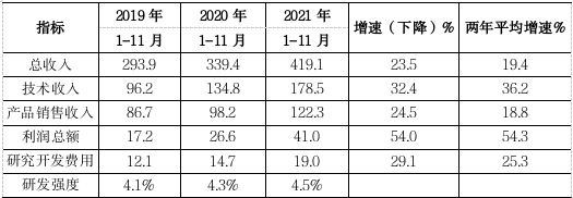 1-11月,丰台园137家科学研究和技术服务业实现总收入419.1亿元,同比增长23.5%,比园区整体增速高12.7个百分点。四项收入中,占比最大的技术收入178.5亿元,同比增长32.4%,高于园区技术收入增速19.5个百分点。实现利润总额41.0亿元,同比增长54.0%,高于园区整体水平41.5个百分点。投入研究开发费用19.0亿元,同比增长29.1%,两年平均增长25.3%。研发投入强度为4.5,高于园区2.4个百分点,高于服务业整体1.2个百分点。