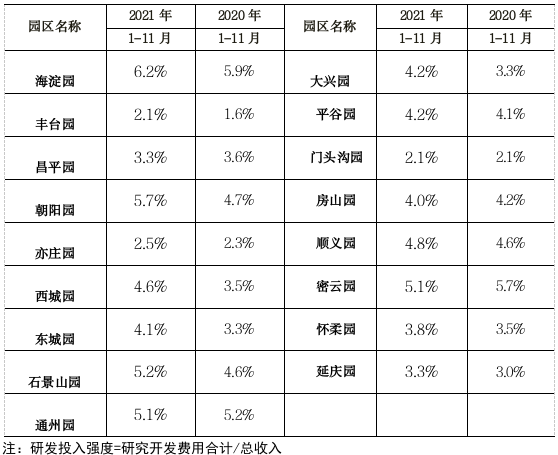 表3 :2020、2021年1-11月一区十六园及经济技术开发区研发投入强度对比