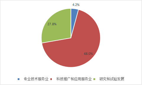 丰台区科学研究和技术服务业三大行业类别中,按收入所占比重顺序分别是专业技术服务业、科技推广和应用服务业、研究与试验发展行业,收入合计分别为327.2亿元、133.6亿元和20.1亿元,分别占到行业总收入的67.8%、29.2%和5.7%(见图2)。