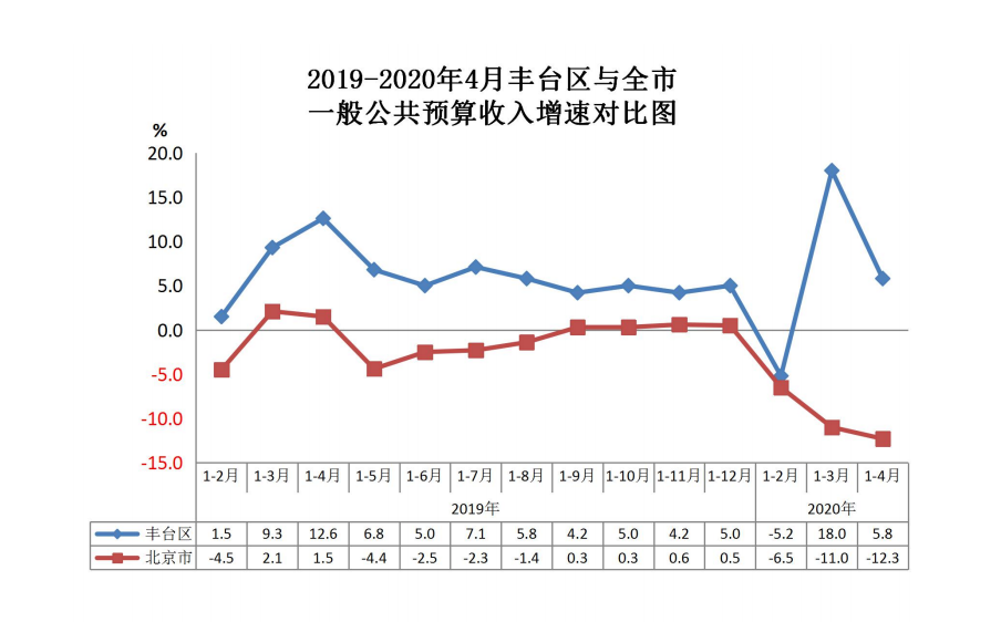 2019-2020年4月丰台区与全市一般公共预算收入增速对比图