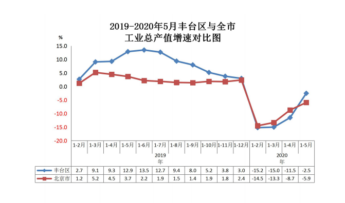 2019-2020年5月丰台区与全市工业总产值增速对比图