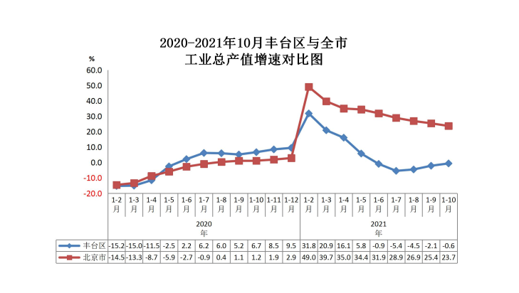2020-2021年10月丰台区与全市工业总产值增速对比图